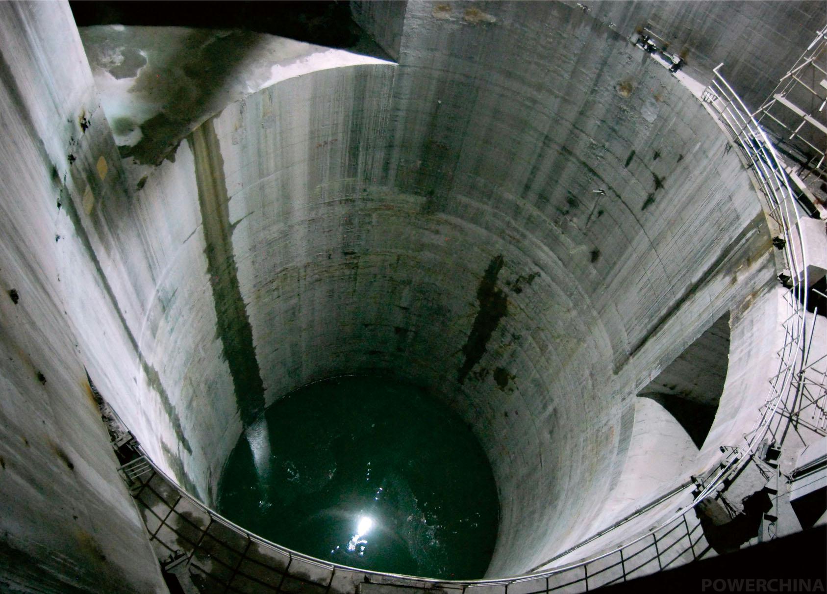 世界級(jí)調(diào)壓井群工程——錦屏二級(jí)水電站調(diào)壓井群,該電站為差動(dòng)式調(diào)壓室,豎井開(kāi)挖直徑32.5×28米,垂直高度為137.3米
